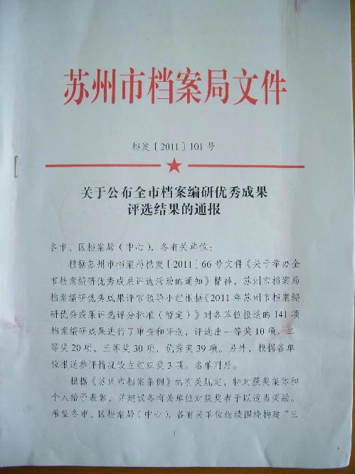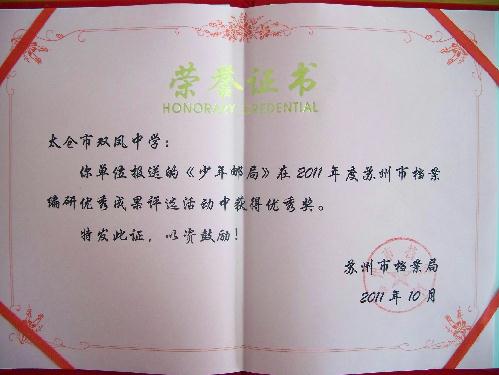 双凤中学报送的《少年邮局》在2011年度苏州市档案编研优秀成果评选活动中荣获优秀奖。
