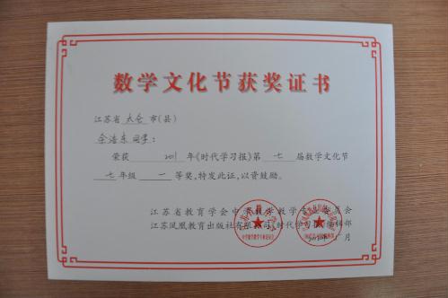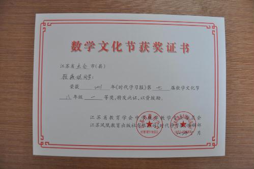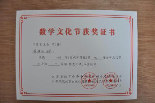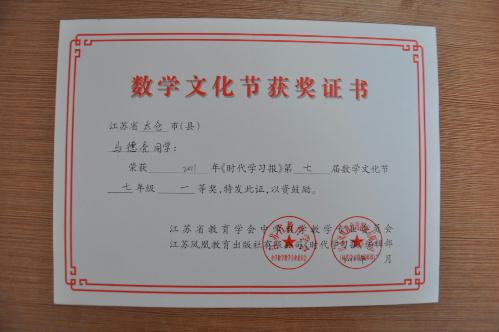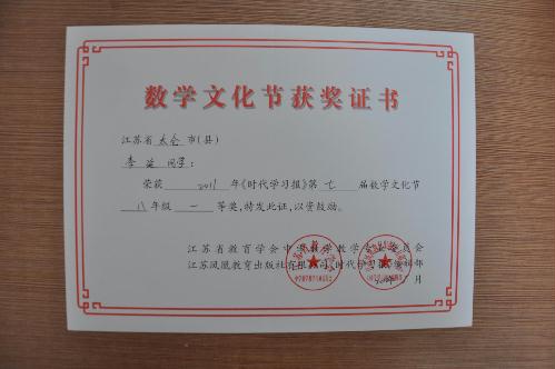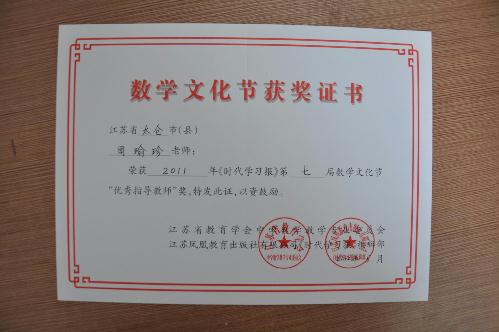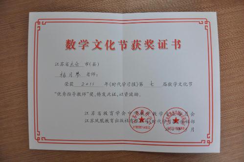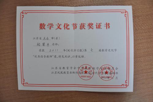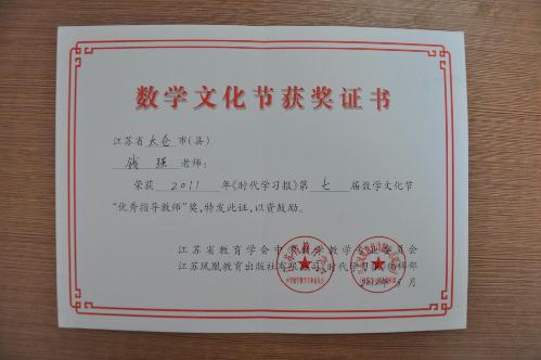 在江苏省2011年《时代学习报》第七届数学文化节活动中,我校师生获得佳绩:柏黎平、杨月琴、钱强、周瑜珍四位老师获得“优秀指导教师”奖;马德亮、徐雅诗、佘浩东、顾燕妮、李延等24位学生获奖。