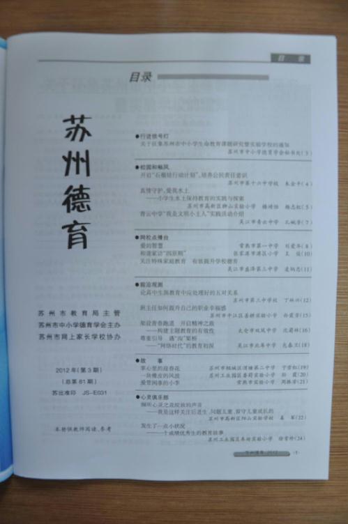 2012年第三期《苏州德育》“前沿观测”专栏刊发我校沈菊林副书记论文专述:《架设青春跑道,开启精神之旅——构建主题教育的有效性》,文章从当前主题教育存在的问题出发阐述了“问题是什么”、“问题为什么”、“问题怎么办”三个基本问题,对构建主题教育有效性进行了理论与实践的探讨。