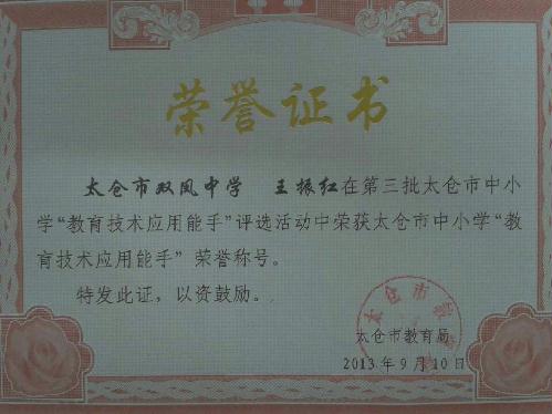 我校王振红老师在第三批太仓市中小学“教育技术应用能手”评选活动中荣获太仓市中小学“教育技术应用能手”荣誉称号