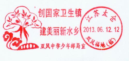 2013年6月12日,太仓双凤中学少年邮局为双凤镇创建国家卫生镇宣传使用一枚连体邮戳。邮戳左图为一幅装饰画,上方有两个少年为宣传环境卫生、绿色生态而舞,下方是一个变形的甲骨文文字“祥”,形如水浪、花叶和水乡的石拱桥。中间宣传文字为“创国家卫生镇 建美丽新水乡”,右方为太仓“双凤福地”临时邮政日戳。双凤镇是太仓水乡古镇,佛教圣地,有双凤福地美称。双凤中学少年邮局这枚邮戳的使用,为家乡创建国家卫生镇、宣传古老的双凤文化贡献一份力量。