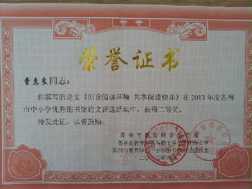 曹惠良老师撰写的论文《创设阅读环境 共享阅读快乐》在2013年度苏州市优秀图书馆论文评选活动中,获得二等奖。