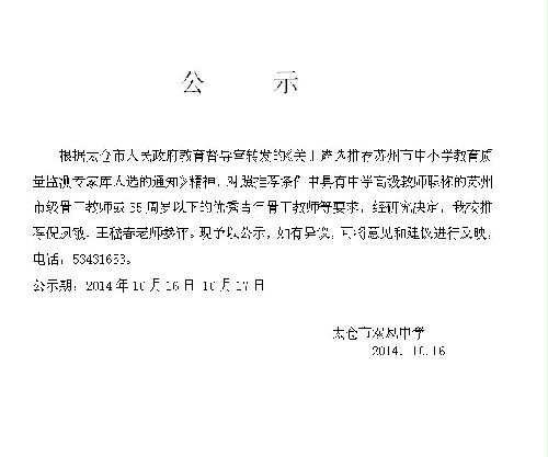 “关于推荐苏州市中小学教育质量监测专家库人选的”公示