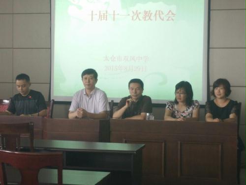 2015年8月29日上午十点,在教学楼三楼会议室举行双凤中学第十届教职工代表大会第十一次会议,会议就增补校务监督委员会小组成员展开,听取了沈菊林主席作的相关说明,通过了大会提交的建议名单,圆满完成了会议预定的目标。