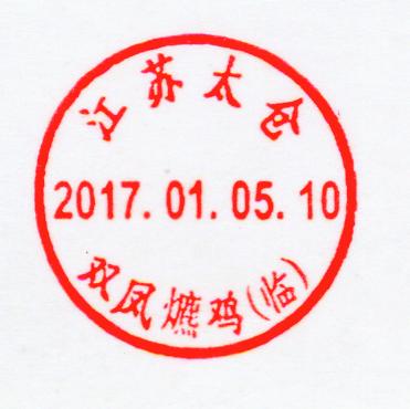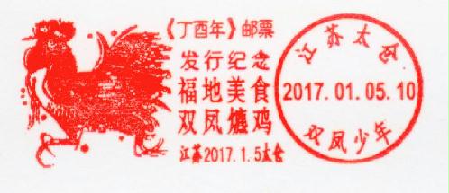 2017年1月5日,我国《丁酉年》邮票发行,太仓市邮政公司在双凤少年邮局使用“福地美食 双凤爊鸡”连体宣传邮戳和“江苏太仓双凤爊鸡(临)”邮戳一枚。宣传邮戳、临时邮戳有很强的生肖专题信息,值得大家收集。计划1月5日上午两枚邮戳流动苏州市邮票首发、邮展现场使用,扩大宣传范围。1月5日下午、6日上午流动太仓东仓路邮政局营业厅。 ?双凤爊鸡是江苏太仓著名的特色传统小吃。此名菜出自具有1600年历史的历史文化名镇双凤(福地双凤)。双凤爊鸡是江苏传统特产,太仓名菜。选用上等草鸡为主要原料,使用天然香料,黄豆酱油等辅料,采用现代真空包装和灭菌技术精制而成双凤爊鸡不断适应现代新口味,其鸡肉酥而不烂,鸡汁油而不腻,在常温下可储藏,6个月不变质并保持原有独特风味,是旅游食品、家宴佐餐和馈赠亲友之佳品。目前已发展为系列产品,有爊鸡、鸡肫、鸡爪、鸡翅、爊鸭等。双凤爊鸡系列不但在国内市场被称为“水乡一绝”、“江南美味”,还受到了日本、韩国、美国以及台港澳海外朋友的啧啧称赞,许多老外品尝后,由衷地翘起大拇指说“OK”。双凤爊鸡食品曾荣获江苏食品博览会金奖、香港国际食品博览会金奖、中国国际食品博览会质量之星、江苏省消费者协会推荐商品、苏州市名牌产品等殊荣。