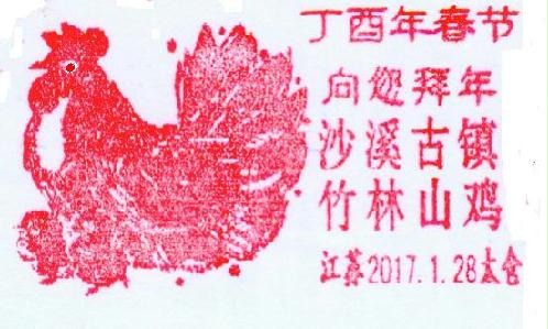 太仓市邮政公司、集邮公司利用双凤少年邮局平台,在今年春节(1月28日)对外使用“拜年”邮戳和“竹林山鸡(临)”邮戳,与1月5日使用的“生肖文化节”纪念邮戳、“双凤爊鸡(临)”邮戳成为系列生肖邮戳。由于春节太仓市各支局休息,双凤少年邮局这两枚邮戳将流动到太仓东仓路邮政总局营业厅使用,欢迎广大市民、集邮爱好者收集。双凤少年邮局为丰富太仓市春节文化生活、弘扬中华生肖文化、宣传太仓沙溪古镇作出贡献。