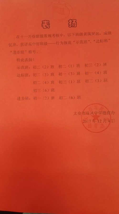 首先是升旗手介绍:今天的升旗手是初二(3)班的范薛烨和姜可凡同学 范薛烨是初二三班的班长,她是老师的小助手,同学们的好榜样。性格活泼开朗,热爱班集体。乐于助人,做事一丝不苟,认真负责好每一项工作。作为光荣升旗手的她,相信以后会更加努力,取得更大的进步! 姜可凡是初二(3)班的英语课代表,她工作认真。虽然性格腼腆,但待人诚恳。在生活上,能够做到自己的事情自己做,踏实勤劳,一丝不苟;在与人相处的时候,能够做到礼貌待人,乐于助人;在对待长辈时,能够做到尊敬师长。她热爱集体,关心集体。相信她以后会取得更大的进步 ? 下面是国旗下讲话:初一(1)班?丁亮 尊敬的老师、亲爱的同学们: 大家早上好!今天我国旗下讲话的题目是:《严以律己,做遵纪守法的好少年》。 同学们你们知道吗,每年的12月4日,是全国法制宣传日。中国有句古话“没有规矩不成方圆”。这就是说,无论做什么事都要有个规矩,否则什么也做不成。对国家、社会来说,这个规矩就是法。大到一个国家,小到一个集体、个人,都不能置身于法律之外,更不能凌驾于法律之上。我们中学生作为国家的小公民、社会的小主人,必须做到知法、懂法、守法,保护我们自身的权益,不损害他人和社会的利益。国无法不治,民无法不立。我们全校同学应一起学法,守法,用法,宣传法。 一、学法。我们每一个学生只有学习了法制知识,才能知道什么是合法,什么是违法,学会分辨是非,识别善恶,从小养成遵纪守法的良好习惯。 二、守法。明天的中国将是一个法制更加完备的社会,而我们每一个公民必须具备较高的法律素质。只有懂法守法,才能依法办事,远离犯罪边缘线。 三、用法。法制法规无处不在。它像是我们身旁的骑士,时刻保护着我们。我们应该合理的运用法律知识来保护我们应该享有的权利和义务。 四、宣传法。我们学生不仅需要用法制的知识武装头脑,还要用法制的意识武装中国。我们应该鼓励我们身边的人,特别是我们的家长,让他们一起学习和掌握法制知识。唯有如此,才能使我国实现依法治国的法制目标。 作为21世纪的学生,学习、掌握必要的法制知识,是我们素质教育的重要组成部分。法制教育不仅影响着我们的学生时代,更影响着我们的终生。 国有国法,校有校规。有的同学对校纪校规视而不见,忽视学校对学生仪容仪表、待人接物、行为言语等方面的要求,这是十分不耻的行为现象。 在这里,我还想向大家提出几点倡议: 1.自觉遵纪守法,自觉维护校园秩序,不追逐打闹。 2.上下楼梯时,做到保持安静有序,轻声慢步靠右走,一旦发现前面有拥挤的情况,要立即停止前进,耐心等待,听从指挥。 3.体育课和大课间活动要遵守纪律,规范活动。 4.要不断提高明辨是非的能力,自觉遵纪守法,学会用法律保护自己。 俗话说,十年树木,百年树人。同学们,让我们行动起来,从自身做起,从身边小事做起,做个知法、懂法、守法的好少年吧! ? 王振红主任:常规考核表彰