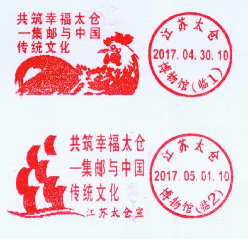 4月30日至6月15日由太仓市政协主办,太仓市文广新局、中国石化江苏石油分公司、江苏公安集邮协会协办,太仓博物馆、太仓市集邮协会承办的“集邮与中国传统文化”联展在太仓博物馆举办。太仓市邮政公司分别于4月30日、5月1日使用连体宣传邮戳两枚,宣传图案分别是大雄鸡(吉祥图)、郑和宝船图(太仓对外宣传标志),宣传文字“共筑幸福太仓——集邮与中国传统文化”,即这次联展宣传主题。邮政日戳分别为“太仓博物馆”(临1、临2)。此次联展汇聚了享誉国际国内的集藏大家王剑智、征争、姜达政、范利清、道文进、唐中杰、曹兴龙等2500多件邮品、地图、信札等,将百科知识的趣味性、文化发展的客观性、雅俗共赏的群众性、怡情养性的娱乐性融为一体,以不同视角和多元层次,深切表达对生活的美好憧憬,向世人阐释“幸福太仓”。连体宣传邮戳是双凤少年邮局设计,欢迎学生到少年邮局加盖。希望广大师生双休日到太仓博物馆参观集邮联展。