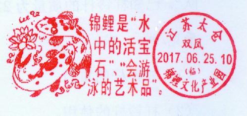 6月25日,我国发行《锦鲤》特种邮票,为宣传太仓双凤水乡古镇的锦鲤文化产业园,太仓市邮政分公司使用连体宣传邮戳一枚,临时邮政日戳为“江苏太仓双凤文化产业园(临)”,宣传戳图案为二条喜撒的锦鲤,宣传文字为“锦鲤是‘水中的活宝石’、‘会游泳的艺术品’”。太仓双凤有启弘锦鲤养殖场、东方锦鲤文化产业园。其中东方锦鲤文化产业园面积665亩,建成综合楼500平方米、科技超市800平方米、温室育苗大棚2400平方米、高标准鱼池300亩。池养当岁黄鲤5000多条,还有其它珍贵品种:有御三家、五色、白写、秋翠、芥子鲤、茶鲤等,出口文莱、伊朗、法国、意大利等国家。太仓双凤锦鲤文化产业园接下来还要建设锦鲤文化中心、锦鲤主题公园、锦鲤品鉴中心、锦鲤工艺品开发,形成锦鲤繁育和展示基地等,推出锦鲤拍卖、观光等旅游文化项目。 6月26日,我国发行《国际禁毒日》纪念邮票,28365-365体育投注举办禁毒手绘封比赛,双凤少年邮局使用禁毒连体宣传邮戳一枚,图案为禁毒宣传作品,宣传文字为我国今年国际禁毒日宣传主题“无毒青春 ?健康生活”。获奖的手绘封将制作《国际禁毒日》邮票首日封,成为禁毒专题邮品和学校禁毒宣传品。